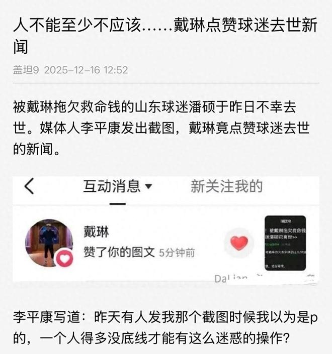 济南的冬天总是笼罩在湿冷的空气中。 2022年鲁能主场对阵国安的比赛中,潘硕裹着印有戴琳名字的围巾,举着“团队要坚强”的横幅,在看台上喊得声嘶力竭——那是他追戴琳近十年后第37场直播比赛。比赛结束后,他挤进球员通道,领取了一周攒下来的钱。零食递到了戴林的面前:“哥,你现在好帅啊!”当时,潘硕并不认为一年后付给“偶像”的7万元会是他躺在重症监护室、抓着手机时迫不及待的救命钱;他也没想到,在他死后,这位“偶像”会给“他死”的消息抹上耀眼的红色。 2023年1月,大森提林给潘硕发信息:“兄弟,我这里遇到了一些困难,需要借7万元还,月底还。”潘硕刚出道当时他在工作,手里的积蓄只有5万元。他向小商人借了2万元,当天就把钱转了出去。拿着手写的欠条,潘硕笑着对朋友说:“那是戴林,我的偶像能给我一些钱吗?”这个“偶像滤镜”已经成为他的胸中刺。 2024年8月,潘硕被诊断出肝硬化、肝功能衰竭。当他第一次进入ICU时,医生说“后续治疗费用至少要几十万”。房子挂牌了,车也卖了。他躺在病床上,一边打着针,一边给戴林发消息:“哥,我在ICU,能不能先把钱还给我,救命啊。”等待的不是转账,而是7元的付款通知,声音是:“还需要付这点钱吗?介意吗?”接下来的几个月里,20元、50元的转账纷至沓来,每一笔都像巴掌一样——潘硕的阿姨说,她有时会盯着那些照片哭:“我当初为什么要相信他呢?”当病危通知书第三次下达时,潘硕抓起手机,给戴林发了最后一条信息:“哥,我快撑不下去了,加油,那笔钱是我当初攒下来的礼物,现在是我的救命钱了。”这次来的却是“删帖还钱”的威胁:戴琳让他删除朋友圈里的讨债内容,并转了3000元。潘硕把它取下来,但剩下的钱却没有等到他闭上眼睛。 2025年12月15日晚,潘硕的呼吸机被拔掉,手机上最后一条未读信息是戴琳发来的“别再打扰我了”。第二天,媒体人李平康晒出了一张截图:戴琳的账号给“山东球迷潘硕因肝功能衰竭去世”的消息点了红。评论区炸了——有人他贴出了戴琳比赛的票根,并哭诉:“我攒了三个月的食物买票,现在却生病了”;一些鲁能老球迷表示,“我们以前叫他‘戴队’,因为我们觉得他打球风格很硬朗,但没想到他是这样的人”。仍有人挖出2023年的旧闻:戴林欠别人28万,被记录为失信,但粉丝帮他说,“戴哥只是暂时遇到麻烦”。但现在,“一时贫困”的戴林拿着粉丝救命的钱来羞辱人,甚至在粉丝死后还喜欢他们。这在哪里意味着“未偿还的债务”?它摧毁和践踏“信任”,把“善意”视为可以。垃圾随意浪费。潘硕追了他十年,无数次喊他“来”,花了七万元帮助他渡过难关。最终他得到的只是7块钱的羞辱和一个耀眼的“赞”。他作为前国足的身份球员及其作为职业球员的声誉在这些行动中受到损害。我爱年轻的粉丝,视你们为一盏灯;但你却把这份爱粉碎成了刺穿他们的玻璃碎片。潘硕的葬礼上,姨妈将那张皱巴巴的欠条放在骨灰盒旁——“他到死都会一直这样说,戴哥会偿还的。”但戴琳的赞美却如同冷冰冰的回应:你的善良,你的等待,你的生活对我来说连“乱七八糟”都算不上。我们总说“偶像必须值得粉丝喜爱”,戴琳却踩到了“人性”的要点:借钱不还叫失信,羞辱重病叫作恶,歌颂死者叫不人道。他把“人”字写反了。