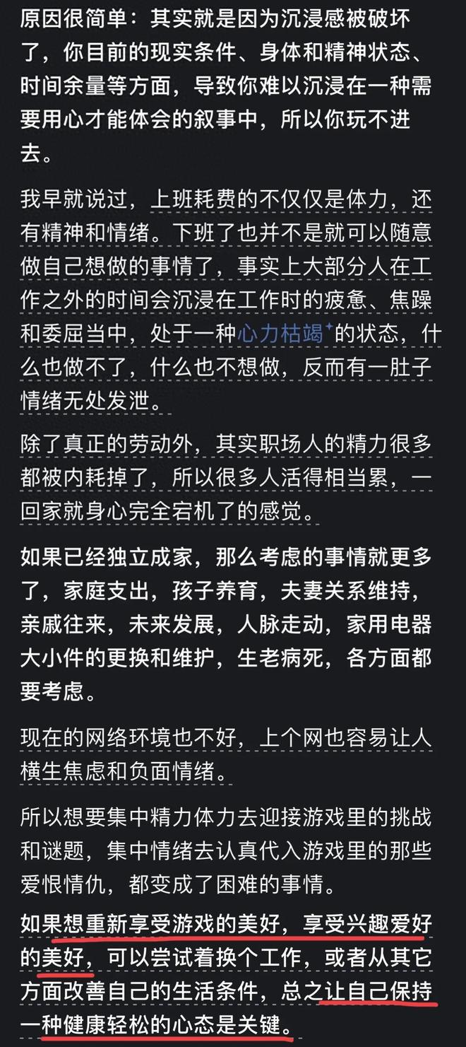 今天,小编在某论坛发现了一个话题:很多人从小就沉迷于游戏。他们玩了所有流行的游戏,从街头霸王到电脑游戏再到手机游戏。然而,当很多人开始工作后,玩游戏的时间就减少了很多,有的人甚至不再玩了。这是为什么呢?网友回答:其实游戏还是同一个游戏,只不过不再是一个玩得心烦意乱就需要沉浸感的游戏了。只能玩几十分钟甚至十几分钟的快速游戏。主要是很多游戏,玩了几天之后,出了点事,就停了几天。当我回来玩的时候,我就没有这种感觉了。比如今年的博3,我持续玩了100多个小时,终于达到了飞龙的水平。后来发生了一件事,我就停了一周。当我重新上线时,我在哪里,我是谁,我应该做什么?算了,玩dota 2吧。我会永远照顾我的妻子。乙或是在他人的怀抱中,或是在房间里启发自己;或者因为信任,我可以放下我的肉身。虽然兴趣不同,平静和焦躁也不同,但当你为自己所发现的东西感到高兴时,你对自己暂时感到满足,你幸福自足,你不知道老年即将来临;当你对所做的事情感到厌倦时,你的情绪就会改变事情,你就会充满情绪。我不玩的另一个原因是我没有精力。工作和生活占据了我所有的精力。这是正确的。下班回到家,我看着Steam库里一堆疯狂的游戏,我选择关掉手机去睡觉。这是真实的。下班回家我没有太多精力,所以很难集中精力玩新游戏。随便玩也无所谓,但学习新东西就像加班一样。是的,你需要控制多巴胺和内啡肽的平衡插入。不要让自己在一段时间内玩得太久。玩适当的游戏确实很好。游戏的类型有很多种,你提到的只是其中的一部分,而不是最好的部分。如果有时间,可以联系其他类型,而不限于特定类别。最后:随着年龄的增长,我们的想法会发生变化。现实生活中我们更加注重亲情、友情和健康,对虚拟世界的兴趣逐渐减少。但同时玩游戏绝对没有坏处。它可以提升每个人的思维能力,也可以在我们感到疲劳的时候放松身心、减压。当然,不要完全沉迷于游戏。毕竟,游戏只是生活的一部分。家属们,你们怎么看?