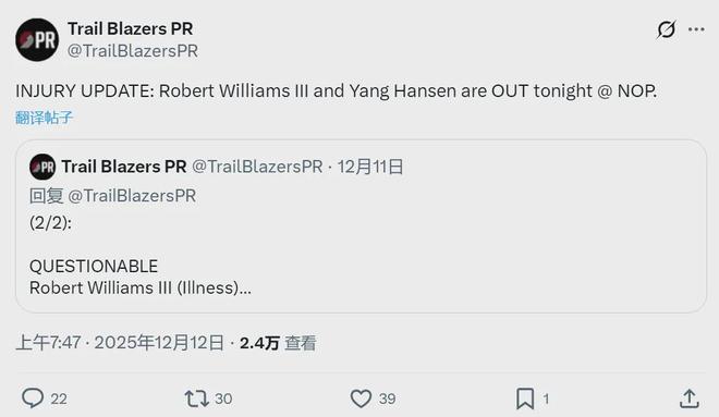 北京时间12月12日,NBA常规赛:鹈鹕队主场迎战开拓者队。赛前,开拓者队官方宣布:杨汉森(面部挫伤)和洛维(生病)今天将缺阵。这是杨汉森进入NBA以来第一次因伤缺席比赛。克林根今天也没有参加比赛。如果肖阳没有受伤,倒是还有机会。杨汉森是怎么受伤的?开拓者队在最后一场比赛(12 月 8 日)对阵灰熊队。杨汉森首发19分13秒,5投2中得到4分5篮板2助攻2失误5犯规,正负值+2。第四节,杨汉森两次单打扎克·艾迪成功。当小埃迪第三次在篮下唱歌时,他被后者击中脸部,痛苦地倒在地上。当时裁判并没有吹哨。开拓者队主帅非常生气,赛后一位T.斯普利特说道:“我想挑战罚球当杨汉森摔倒时,裁判却没有给挑战的时间。不管哪个球员受伤倒地,裁判都应该过去看看,确认球员是否没事。”那场比赛是杨汉森在NBA职业生涯的第一次首发。赛后记者要求杨汉森评价他的表现。肖杨回答说:“这场比赛真的不好,所以我不会评价自己。上半场我太紧张了,需要总结和提高。我想从扎克·艾迪那里知道,有多少男人能在NBA生存下来。”这个伤病比想象的还要严重。12月10日发展联盟原本有训练和比赛,但杨汉森身体不好,没有参加。本赛季杨汉森在发展联盟场均上场31.6分钟,得到16.3分、10.3个篮板、4.7次助攻、2次盖帽、3.3次失误。他的三项命中率是: 45.2%、30.8%、71.4%,杨汉森打了13场NBA比赛,其中1场。开始。场均出场7.7分钟,得到2.6分、1.8篮板、0.8助攻、0.4盖帽、0.7失误。他的三项命中率分别是:30%、6.3%、90%。投篮命中率显然不尽如人意,尤其是三分球,达到了16中1。最后祝肖阳早日康复,回来继续努力!